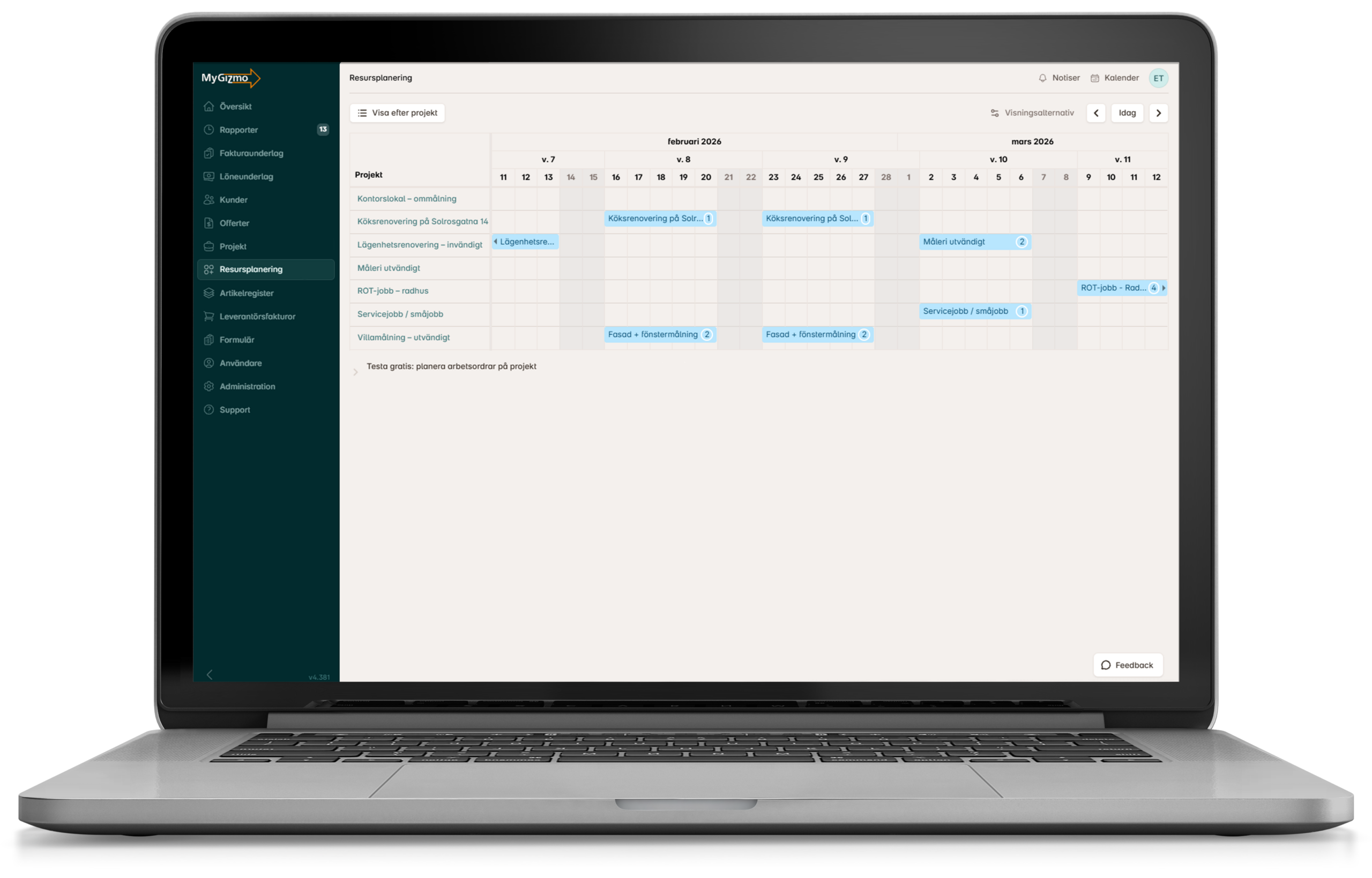 Med MyGizmo samlar du allt på ett ställe – timmar, material, leverantörsfakturor, ÄTA:or, dokument, egenkontroller, planering och tidsplaner. Från offert till faktura och lön, så du slipper leta och hålla allt i huvudet. Projektverktyget är gjort för byggarbetare och hantverkare. Med alla smarta verktyg du behöver för att hålla ordning på byggprojekten och se till att inget missas. Planera, följ upp och ha koll på varje del av jobbet, utan krångel.